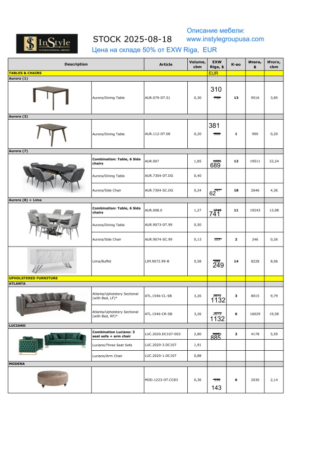 В мире In Style International Group известна своими уникальными коллекциями мебели для гостиной, спальни и столовой. При их разработки учтены самые разные вкусы потребителей -- от гламура до жесткой функциональности. Недаром с компанией сотрудничают ведущие ритейлеры по всему миру. Фирма делает акцент на безупречном качестве своих изделий. И подчеркивает, что оно ощущается в каждой детали – от каркасов до отделки. Изысканная мягкая мебель для гостиной создает уют и ощущение роскоши. Спальные гарнитуры предлагают большое разнообразие кроватей, создавая идеальное место для отдыха и восстановления сил. Широкий выбор мебели для столовой: функциональные столы с разными столешницами – мраморной, стеклянной, деревянной, и удобными стульями. В каталоге даны цены со скидкой в 50%. К этому надо добавить НДС. Рядом указано количество экземпляров на складе.