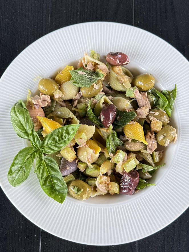 Ингредиенты (на 2 порции): Паста (фузилли или пенне) — 120 г Кабачок или цукини — 1 шт. (средний, не конина) Чеснок — 1 зубчик (можно злой, можно нежный) Оливковое масло Extra Virgin — сколько не жалко Тунец (в собственном соку, а не в масле, нам фигура дороже) — 1 банка Каперсы — 1 ч. л. (или чуть больше, если любишь пикантность) Оливки Каламата — горсть (лучше без косточек, зубы целее) Мята — по вкусу (свежая, не из чайного пакетика) Базилик — пару веточек (можно фиолетовый, будет красиво) Соль — по вкусу Перец — свежемолотый, обязательно, а не тот из прошлого века Как готовим: 1. Отвари пасту до аль денте. Это когда уже съедобно, но ещё можно куснуть. Сливаем воду, остужаем. Если хочется побыстрее — под холодную воду и не парься. 2. Берём сковородку, капаем масло. Раздавливаем зубчик чеснока (не щадим), кидаем в масло — пусть отдаст душу. Как только запах пойдёт — чеснок вылавливаем, нам нужно только волшебство, не сам ведь. 3. На чесночном масле жарим кабачок. Кубиками, румяним слегка, но не превращаем в кашу. Потом остужаем, пусть не парит остальных в салате. 4. Собираем салат: в большую миску кидаем пасту, кабачок, тунец (вилкой разломай, он не обидится), каперсы, оливки. 5. Добавляем зелень. Мяту и базилик рвём руками, нож не нужен — так они вкуснее, будто с грядки прямо в тарелку. 6. Заправляем: оливковым маслом, солью и перцем. Всё перемешиваем и… ну ты понял(а) — ешь и радуйся жизни. Совет от Худейки: С этим салатом можно смело идти на пикник, на балкон, на диван к сериалу — он везде хорош. А ещё на второй день он даже вкуснее, но ты вряд ли дотерпишь. Текст и фото: @hudejkaa в Инстаграме09-10-2025