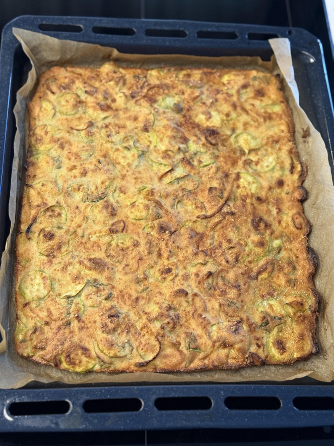 Ингредиенты кабачки, тонкие полукружья — 500 г лук репчатый — 1 шт. чеснок — 2 зубчика яйца — 4 шт. мука рисовая — 200 г молоко — 120-150 мл вода — 50-70 мл (по консистенции) пармезан, тёртый — 60 г базилик свежий — большая горсть оливковое масло — 2 ст. л. соль — 1 ч. л. без горки чёрный перец — по вкусу Приготовление 1. подготовка Кабачки тонко нарезаем, присаливаем, оставляем на 15 минут. Чуть отжимаем — без фанатизма. 2. сладкий лук Лук мелко шинкуем и тушим 3–4 минуты с каплей масла или воды. Чеснок раздавливаем. 3. тесто Яйца взбиваем венчиком с молоком, водой, маслом, солью и перцем. Всыпаем муку, размешиваем до гладкости. Консистенция — как густые сливки. Если густо — подливаем ещё немного воды или сока от кабачков. Подмешиваем 40 г пармезана. 4. сборка В тесто добавляем кабачки, лук, чеснок и рваный базилик. Выливаем смесь тонким слоем на противень с пергаментом и маслом. Посыпаем оставшимся пармезаном и перчиком. 5. хруст Выпекаем при 210 °C 35–40 минут до золотой корочки и хрустящих краёв. Даём постоять 10 минут, режем квадратиками и хрустим Текст и фото: @hudejkaa в Инстаграме05-11-2025